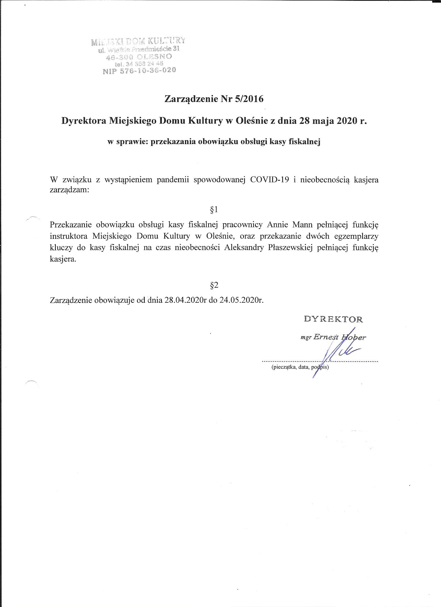 Ernest Hober) - Dodanie załącznika [zarzadzenie_nr__5.jpg] do dokumentu. (Dokument opublikowany)
